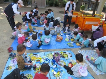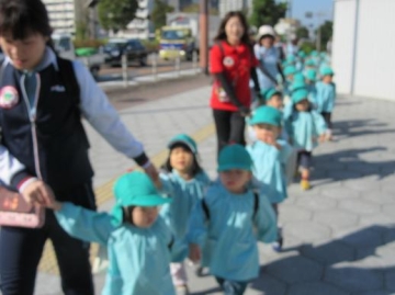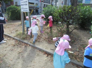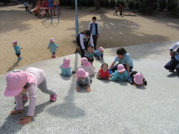 堀江小学校の裏側の公園までりす組さんはがんばって歩きました。ひよこ組さんも4人ほど歩くことができました。