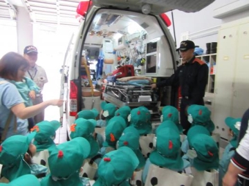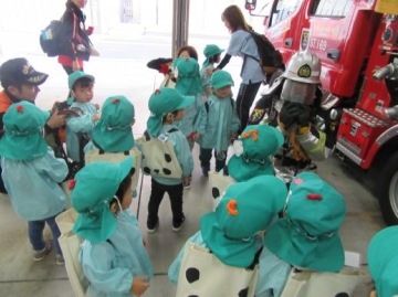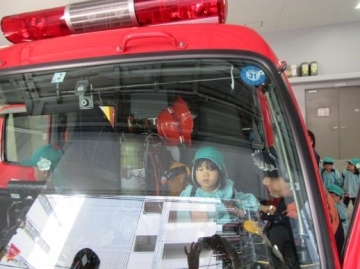 消防署では、ポンプ車の運転席に座ったり、酸素ボンベをかついだり、救急車の中に入ったり・・・署員の方にいっぱいお世話になりました。