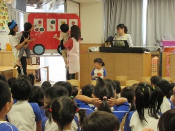 ”お弁当バスにのって”のパネルあそびを誕生児たちがお手伝いしてくれみんなで手遊びなどして楽しみました。