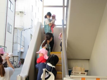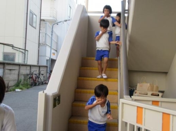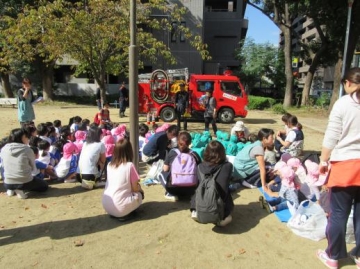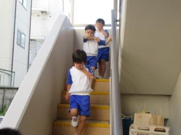 給食室が火元なので1歳児~5歳児は外の非常階段より1階に降りて来ました。ビックリした子もいる中、先生の指示に従って新町西公園へスムーズに避難できていました。
