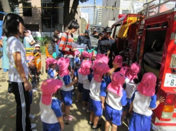 消防自動車(ポンプ車)の見学もでき、車についている部品や道具など「これ何?」・・・と消防士さんに質問し、説明を真剣に聞いていた子ども達でした。