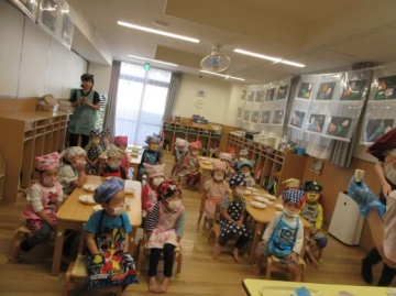 エプロン・三角巾をつけるのはひまわりぐみさんに手伝ってもらいました。