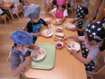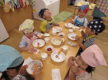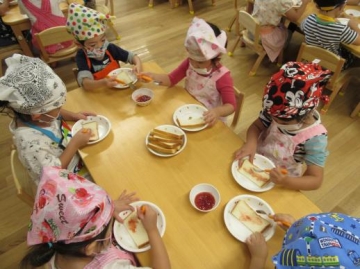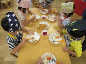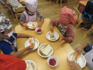 行程は、スプーンにイチゴジャムをすくって食パンにぬる作業です。自分のお皿に食パンをおき、慎重にジャムすくってパンにぬっていました。ぬったパンを半分に折ってそのままいただきました。