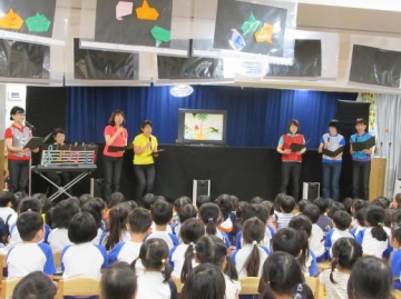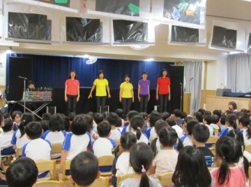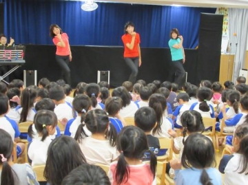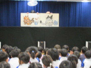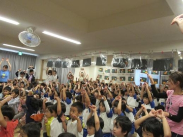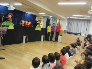 キッズシアター"紙ふうせん”のグループが来てくれ、人形を使った歌や手遊び・大型紙芝居や大型絵本など盛りだくさんの楽しいことを見せていただきました。