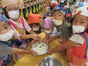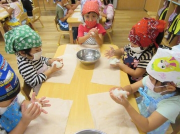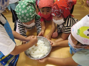 ご飯をつぶすのはグループの友だちがボールを支えて助け合いながら・・・ 形を作るのは手にご飯がくっついてベトベト状態になりながらもハート・星・丸の形に・・中にはいろんな思いがあって細かくなったり・・などもありましたがみんな楽しく作っていました。