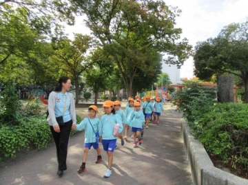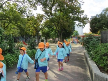 又、信号機のある横断歩道の渡り方も教えていただき、各クラスの子ども達が信号を見て渡りました。