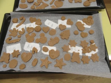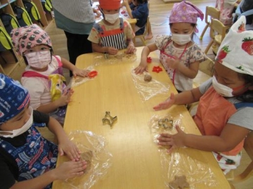 クッキーの生地を型抜きを使って、色々な形を作っていきました。生地の厚さによっては型を抜くのも上手くいかなかったり・・・何度も生地を丸めては作り直し・・・
