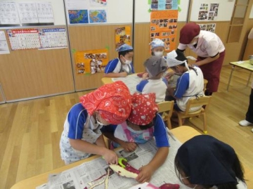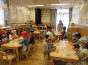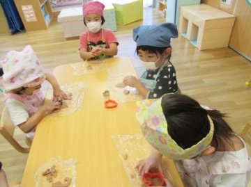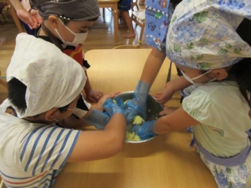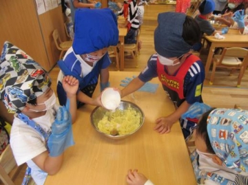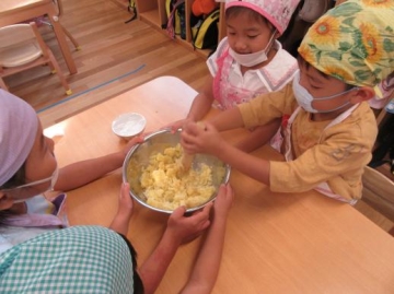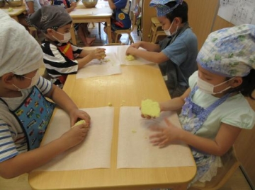 午後からは、茹でたさつま芋に牛乳・バター・砂糖を入れてつぶしながらまぜる作業をしました。次は、自分たちで好きな形を作りました。粘土細工のように色々な形ができ、最後はオーブンで焼いてもらって完成!