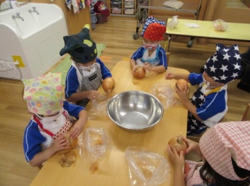 3歳児は、今日の給食ハヤシライスの中に入る玉ねぎの皮むきをしました。
