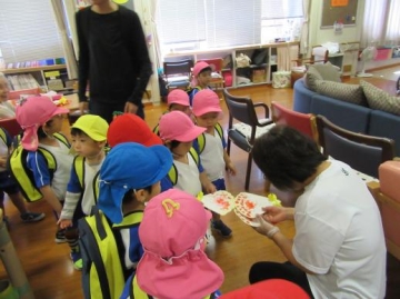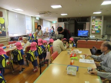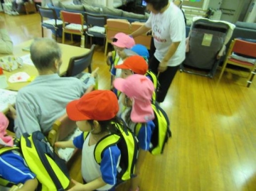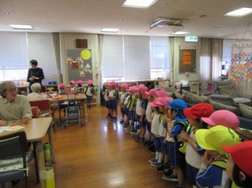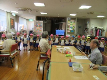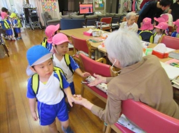 おじいちゃん・おばあちゃんに手作りのお花を一人ひとりにプレゼントしました。プレゼントをとても喜んでいただいてニコニコ笑顔の子ども達でした。