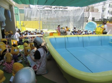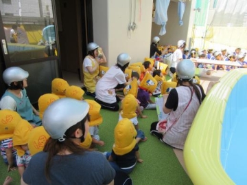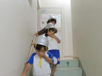 地震の場合は、机やロッカーへ避難し、機敏に行動している幼児ぐみの姿が見られました。また、火災時には口に手を当てる仕草も習慣づいて、日頃の訓練が少しは身についているようです