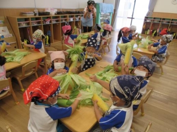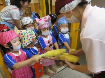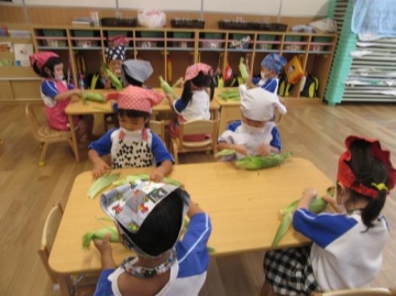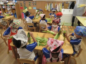 すみれ組がとうもろこしの皮むきをしました。今年度初めての食育で、エプロン・三角巾を持ってくることが楽しみな子ども達。嬉しそうにエプロンを身につけていました。