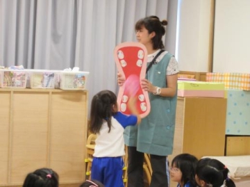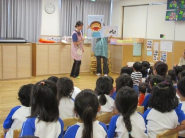手遊びや人形を使った大型紙芝居で磨き方などを見て楽しみました。。