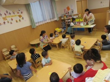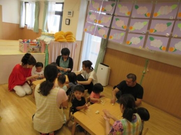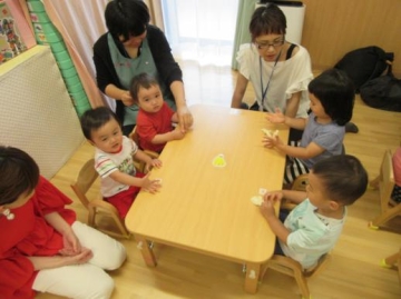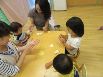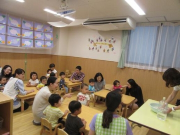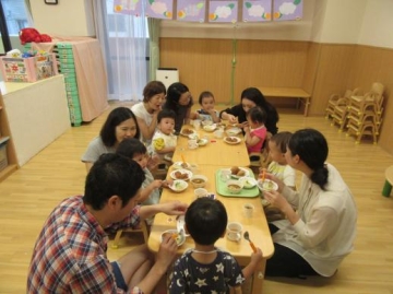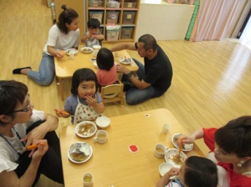 給食時は、お家の方に保育園の給食を試食していただいて 味・形・硬さ・・など実際に見ていただきました。