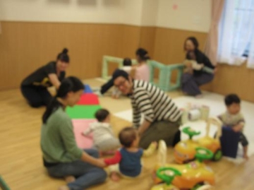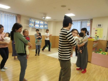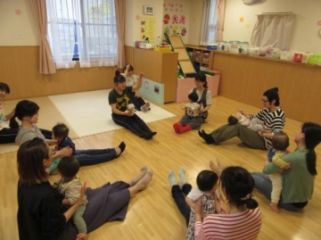 0歳児は、新町カーニバルは参加しなかった為、今日はお父さん・お母さんと一緒に保育室でふれあい遊びを楽しみました。