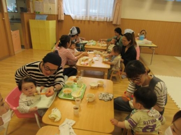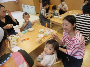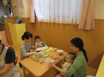 給食時は、離乳食の味付け・大きさ・食べ方や味付けなどを見ていただきました。