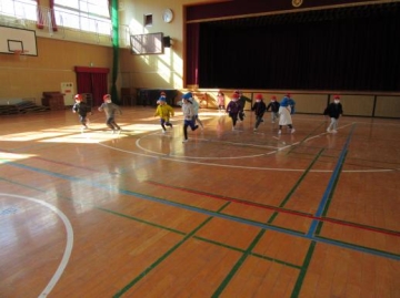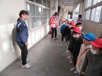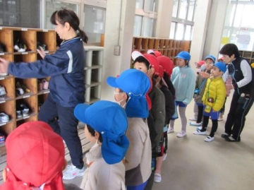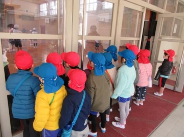小学校では、一年生の一組・二組の序業風景を参観しました。 漢字や引き算の勉強をしている小学生を真剣な表情で見たり又、運動場や体育館でも少し遊んだり、小学校の広さ・大きさにに驚いていた子供たちでした。。