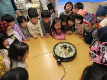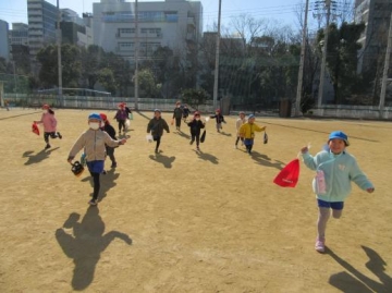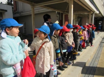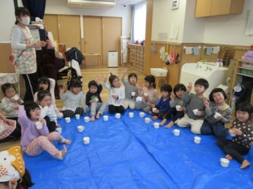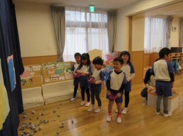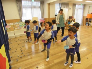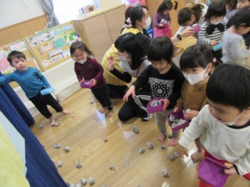 また、節分にちなんで「おなかの中に鬼がいる」という紙芝居を見て、みんなで豆まき(新聞紙を丸めたもの)をして楽しみました。
