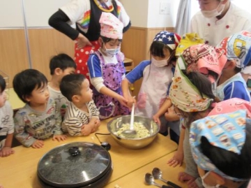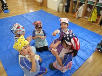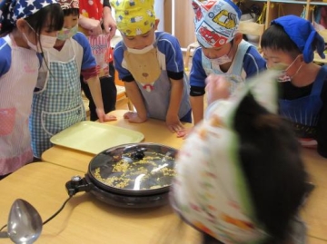 4.5歳児がホットプレートでポップコーンを作りました。2.3歳児の分も作ってくれて、みんなで食べました。