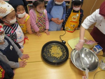 鉄板の上でポン・・ポン・・・と跳ねる様子を不思議そうにみていたこどもたち・・・!5歳児がみんなの分をカップに入れて配ってくれ美味しくいただきました。