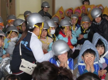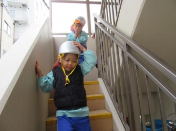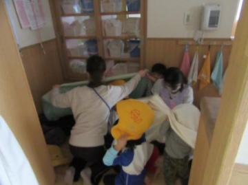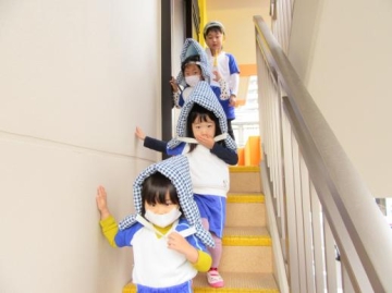大きな音や電気が消え真っ暗になって少し驚いていた子ども達でしたが、保育士の支持にしたがって行動が取れていました。