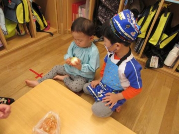 りすぐみ・すみれぐみと一緒に”玉ねぎの皮むき”をしました。