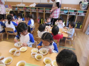 むいた玉ねぎは、給食のスープや炒め物に調理してもらい、お昼の給食でにみんな一緒にいただきました。。