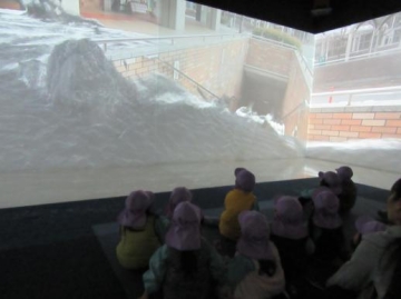 地震が起きて津波が来ることを想定した映像を見て、音も迫力があり少しビックリしていた子もいました。