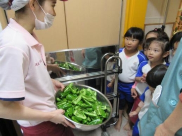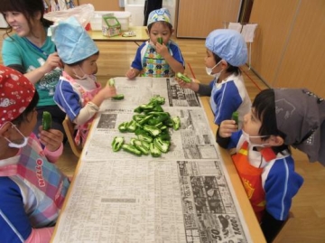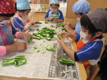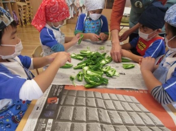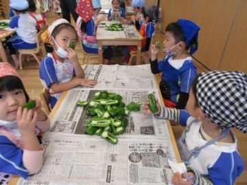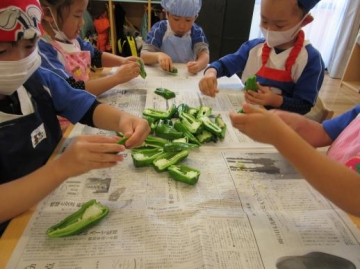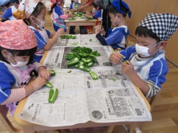 4歳児が、給食で使う食材”ピーマン”の種取りをしました。
