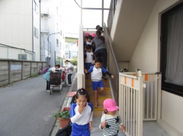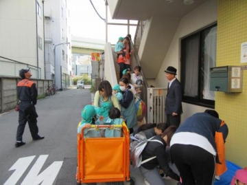 1階給食室から火災発生を想定した避難訓練をしました。