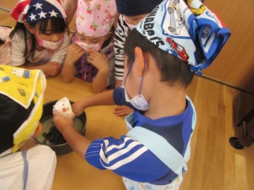 5歳児が3時のおやつの”わかめおにぎりを作りました。