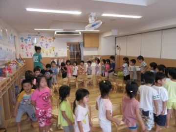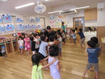 さくら組の子どもたちと一緒にプールに入ったり、いす取りゲームやじゃんけん列車ゲームなどをして遊びました。