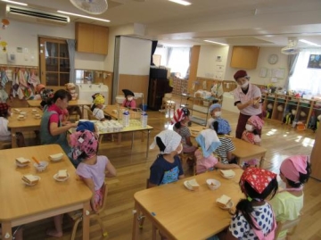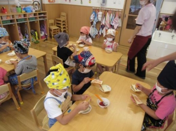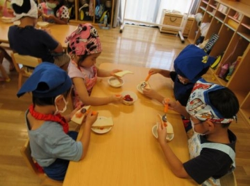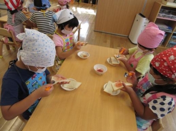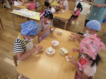 4・5歳児が3時のおやつ ”ジャムサンド”を自分でイチゴジャムを食パンにぬって食べました。