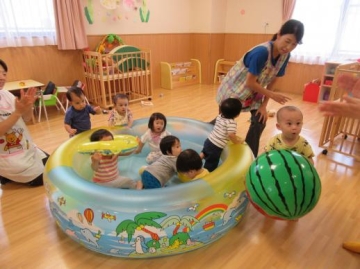 0歳児は、ビニールプールでボール遊び・・・