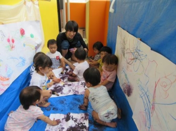1歳児は、絵の具で感触遊び・・・