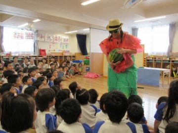手品でいろんなスイカを出してくれ、最後には大きなすいかが2個出て来ました。