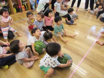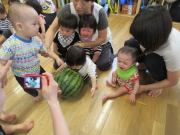 0・1歳児クラスは大きなスイカを目の前で見て、触り・・・