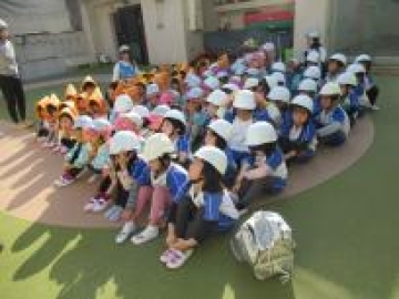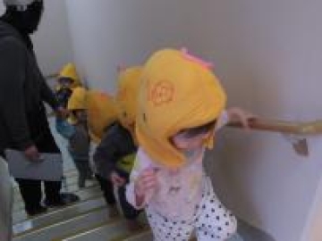しばらくして、近隣の木津川の水が氾濫した想定で幼児クラスは屋上へ、乳児クラスは3階の4歳児クラスへ避難しました。
