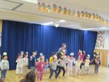 ひよこ組さんは、保育室でペープサートを見たり、遊具で遊んだり、体操をしたり・・