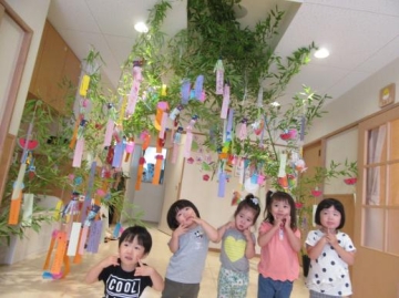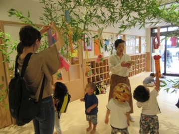 又、前日に親子で笹飾りを一緒につけたものを各クラスから笹飾りを紹介して見せ合いました。
