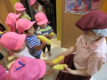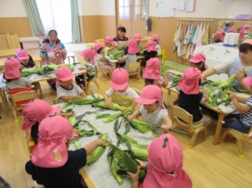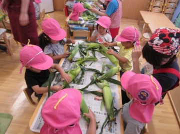 3時のおやつで食べる ”とうもろこし” の皮むきを2歳児が始めてチャレンジしました。