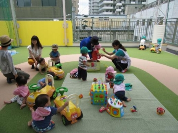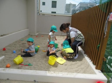 4階屋上の園庭で、0歳児・1歳児の子どもたちと一緒に砂遊びや、手押し車や遊具で遊びました。