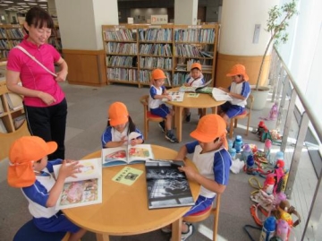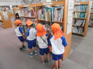 昨年から図書館へは、絵本を借りによく行っていた子どもたちなので静かにすること・本を大事に扱うことなど・・少しずつ身につけたようです。