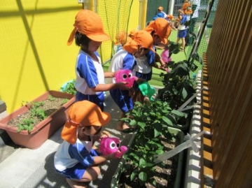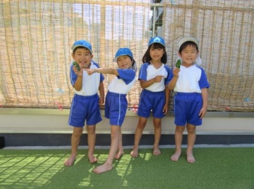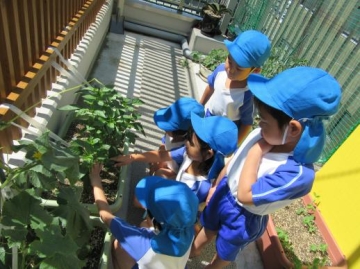 4・5歳児が連休明けに植えたきゅうりに実がつきました。毎日みずやりをがんばっていた子どもたちです。