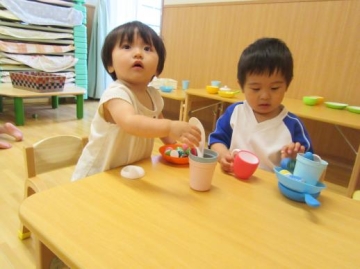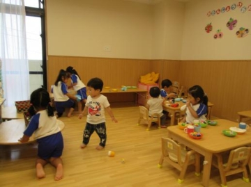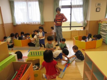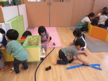 りすぐみとすみれぐみが1歳児の部屋で一緒に遊びました。