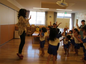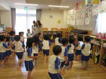 歌を歌いながらボールを隣へ渡して、止まったところでボールを持っていた子どもが自分の名前を言ったり、ウオーキングゲームをしたり・・・と 楽しそうに遊んでいました。
