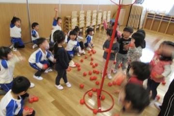 体操・ふれあい遊び・玉いれなどを2歳児・3歳児が触れ合って遊びました。