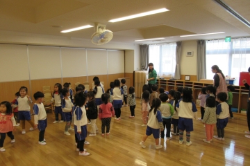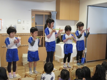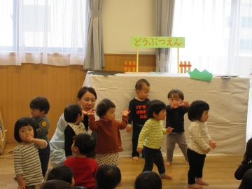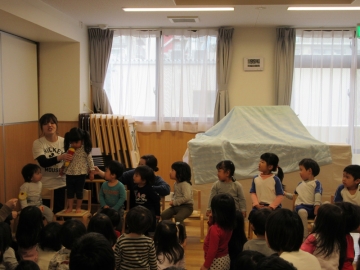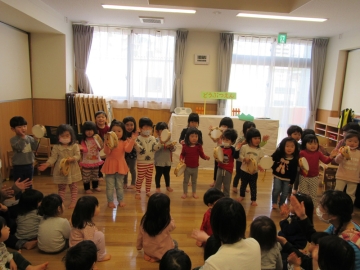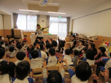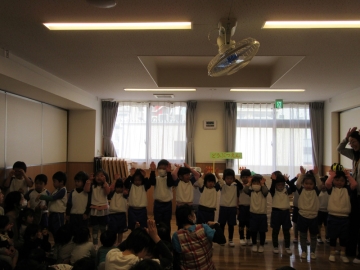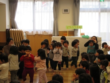 バス遠足にちなんだぺープサートをみたり、各クラスからの出し物をみたりしてみんなで楽しみました。