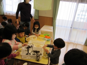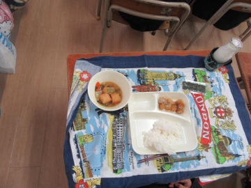 給食時間には、ナプキン・コップを机に準備することや自分たちで配膳をすることなど見せていただきました。