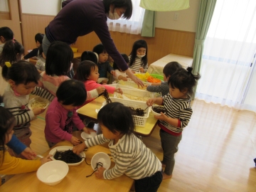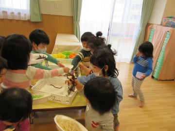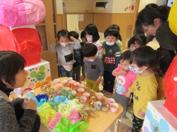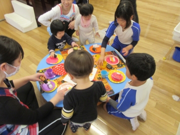 4・5歳児が店やになって0歳児をリードして、やり取りなども楽しそうにしていました。